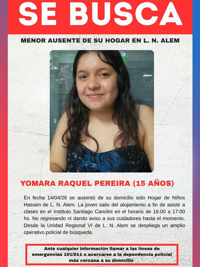 La Policía de Misiones solicita la colaboración de la comunidad para dar con el paradero de Yomara Raquel Pereira, de 15 años, quien se encuentra ausente de su hogar en la localidad de Leandro N. Alem desde este 14 de abril.